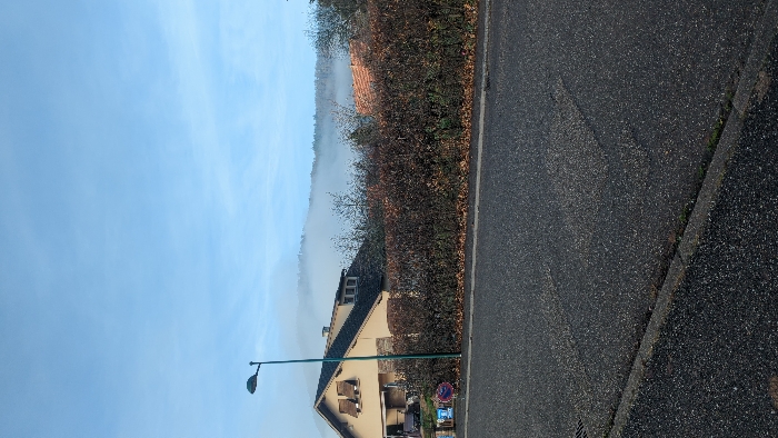 The image depicts an outdoor street scene in Châtenois, France, presenting a static view of residential architecture, vegetation, and a natural landscape under a clear, partially hazy sky. In the foreground, a dark gray asphalt road surface occupies the lower half of the frame, separated by a dark gray curb from a narrow, unpaved strip or sidewalk. No vehicles or individuals are present on the road. The midground features a dark green lamppost positioned vertically on the left. Behind and slightly to the right of the lamppost, a residential building with light tan walls and a dark gray tiled gable roof is visible. This structure includes windows with dark brown closed shutters and a partially obscured lower-level patio area on the left. Adjacent to the house and extending across the midground to the right is a dense, approximately head-height hedge composed of dark brown and green foliage, with fallen leaves at its base. Behind the hedge, the upper section of an orange-brown tiled roof is partially visible on the right. The background presents a range of mountains or hills partially shrouded in a thick layer of white to light gray fog or mist, which obscures the lower and mid-slopes. Above the fog line, the sky is a clear, light blue with minimal cloud formations. No active subjects or interactions are discernible in the scene.