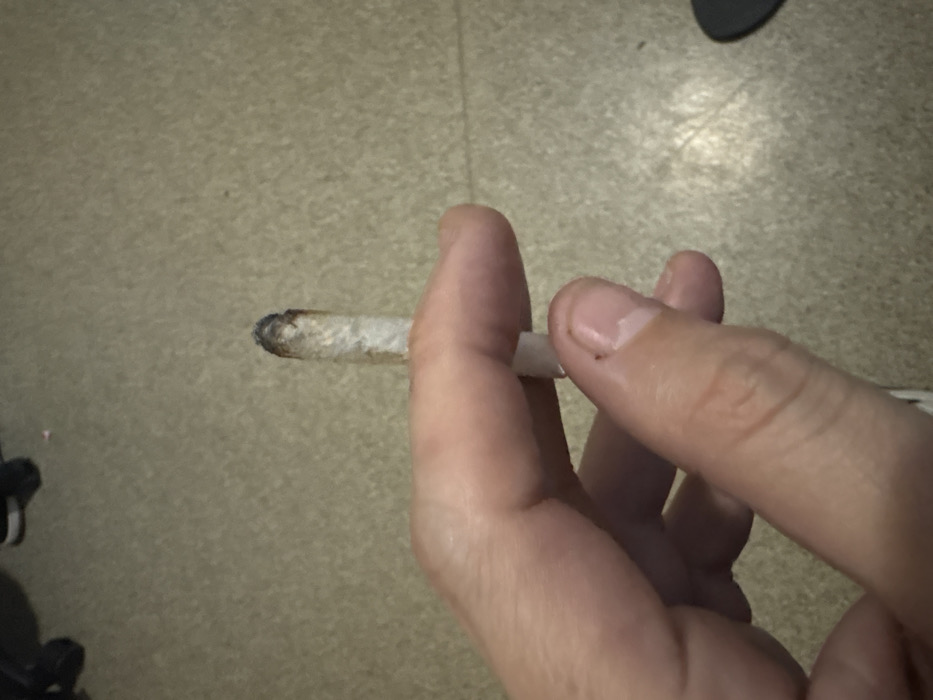 A hand holds a lit cigarette or joint