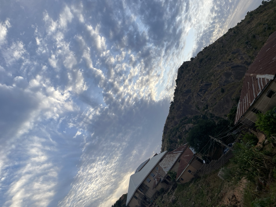 This oblique photograph depicts a mountainous residential area in Gwong, Nigeria, with the scene tilted approximately 30-40 degrees counter-clockwise. The upper two-thirds of the frame is dominated by a sky densely populated with altocumulus and cirrocumulus clouds, displaying varied densities and light exposure, with visible patches of blue sky. On the left mid-ground, a multi-story building with light-colored, possibly metallic, pitched roofs and light brown or beige walls is situated on a steep incline, featuring multiple balconies. Below it, a single-story structure with a rusty, corrugated metal roof and similar wall coloration is present. Further towards the lower right, a third partially visible single-story building also features a rusty corrugated metal roof. The right side and background consist of a large, steep, rocky mountain or hill covered with sparse, dry vegetation. In the immediate foreground on the left, denser green vegetation, including stalks consistent with maize or similar crops, is visible. A utility pole with multiple overhead wires is situated in the mid-left foreground. No individuals, animals, or vehicles are discernible within the frame.