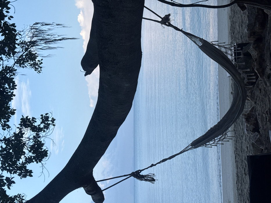 The image depicts an outdoor scene in Tong Yang, Thailand. A large, dark-silhouetted tree branch or trunk extends horizontally across the upper half of the frame. From this branch, an empty, light-colored woven hammock with decorative tassels is suspended by ropes, hanging over a sandy beach. The hammock appears taut and unoccupied. Beyond the beach, calm, light-blue water stretches to the horizon under a partly cloudy blue sky. Silhouetted foliage from the tree is visible in the upper corners, with some hanging root-like structures on the right. A dark, indeterminate object is partially visible in the bottom left foreground, adjacent to the sand and some scattered rocks. No individuals are present in the scene.