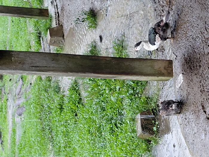 The image portrays an outdoor scene in Keude Cunda, Indonesia, during active rainfall. The ground is saturated with water and mud, interspersed with vibrant green vegetation. Two ducks are visible. On the right, a duck with mottled black and white plumage stands erect on the wet earth, facing towards the left. On the left, a second, predominantly dark-feathered duck is partially obscured behind a prominent, weathered wooden post; it is positioned within a shallow accumulation of water and faces away from the viewer. Streaks of falling rain are discernible in the background. In addition to the foreground post, another similar vertical post is located further back on the right. Two concrete blocks are present: one on the left, partially submerged in water, and another on the right, also situated on the wet ground. Water flows across the muddy surface.