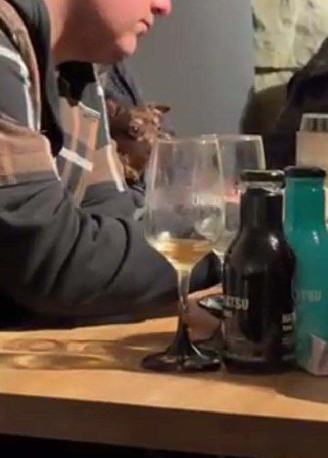 A person with dark curly hair wearing a brown plaid hoodie sits at a wooden table. They are holding a small brown dog with large eyes in their lap. On the table are two wine glasses, one partially filled, and bottles of what appear to be beverages. Other people are at the table, and the background consists of a stone wall.
