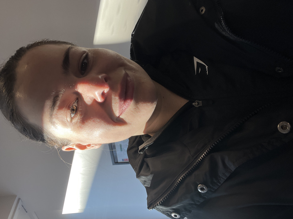 This image depicts a close-up, head-and-shoulders view of a single female individual in an indoor setting in Roubaix, France. The subject, with dark hair appearing pulled back, is looking directly into the camera lens with a slight, closed-lip smile. Her skin is illuminated by strong, directional sunlight originating from the upper-left, highlighting her forehead, nose, and the left side of her face, while casting portions of her right side into shadow. The subject is wearing a black, possibly waterproof or windbreaker-style, hooded jacket. The jacket features a central zipper, which is partially unzipped, and several silver-toned snap buttons visible on the placket covering the zipper. A white, stylized logo, identifiable as "Gymshark," is present on the right chest area of the jacket. In the background, to the upper-left of the subject, a section of a plain, light-colored wall is visible, along with a portion of what appears to be a computer monitor displaying graphical information. The overall scene suggests a self-portrait taken in a room or office environment.
