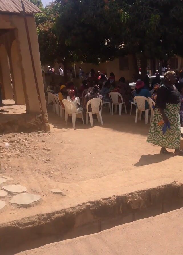 The video begins with an aerial view of a gathering of people sitting on white plastic chairs outdoors