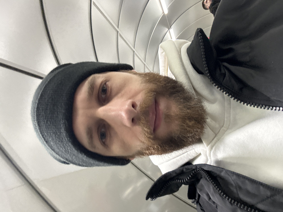 A man takes a selfie, wearing a gray beanie, a white hoodie, and a black jacket with a prominent zipper. He has a short beard and light-colored eyes. The background appears to be an interior space with a curved ceiling and bright lighting. A blurry person is visible in the upper right corner. The camera angle is tilted, providing an unusual perspective.