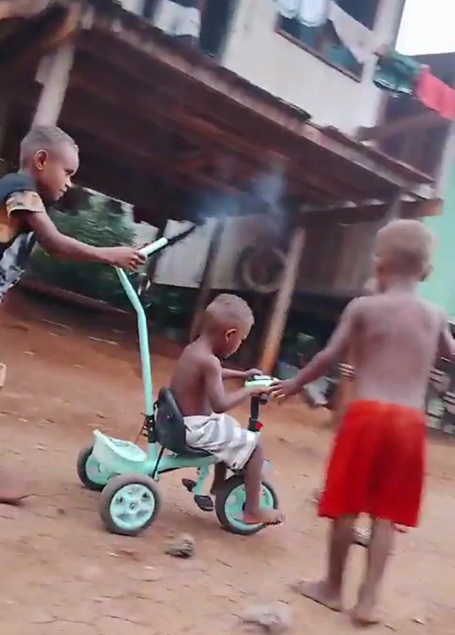 several young children playing outside near some stilt houses. One child is riding a small, mint-green tricycle while another pushes from behind. A different child walks around holding a small flaming object on a wire. The ground is a cracked, reddish-brown dirt. Laundry is hanging to dry on one of the houses.