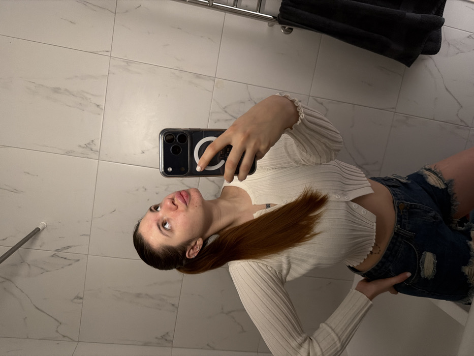The image depicts a waist-up mirror selfie of a young adult female within an indoor setting, specifically a bathroom