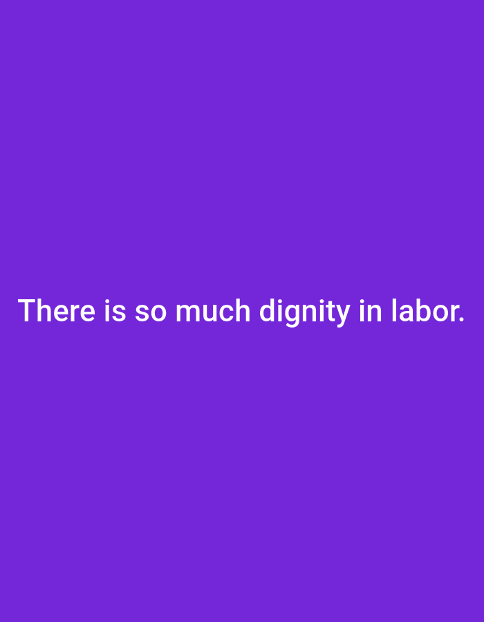 The image presents a solid purple background. Centered on this background is white, sans-serif text which reads: "There is so much dignity in labor." No individuals, specific objects, or discernible actions are depicted. The scene is a two-dimensional display of text on a color field, occurring in the city of Unknown, Unknown.