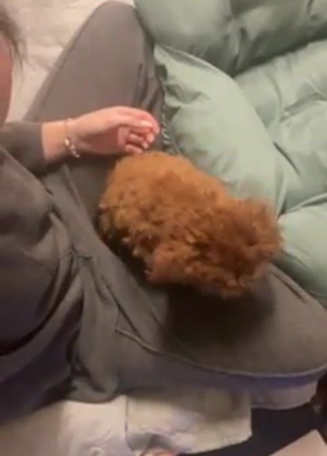 person sitting in bed petting a small, brown poodle