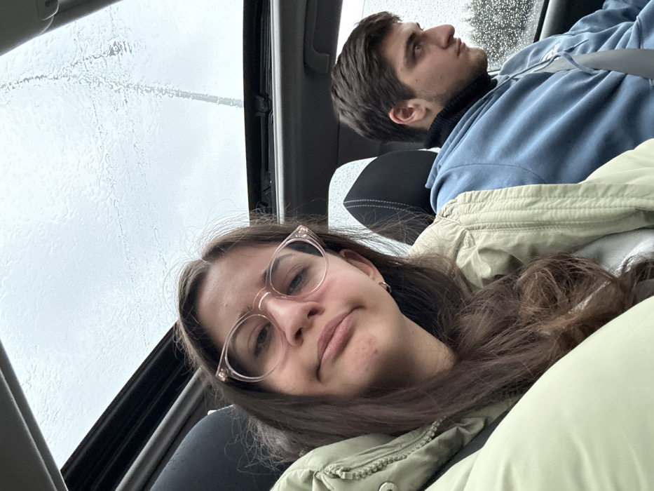 The image displays two individuals inside a vehicle, stated to be located in Zahesi, Georgia. In the foreground, a female with long brown hair and clear-framed eyeglasses occupies the passenger seat, wearing a light, possibly quilted, jacket and a small silver hoop earring on her left ear. She looks directly towards the camera with a neutral expression. Behind her and to the right, a male sits in the driver's seat, wearing a dark turtleneck under a light blue hoodie, secured by a seatbelt. He is observed looking out the right-side window, away from the camera. The vehicle features an open glass sunroof and side windows, all exhibiting visible raindrops, indicating current or recent precipitation. Through the sunroof, an overcast sky is visible, and through the side window, blurred green foliage and an indistinct dark vertical object are present in the background.