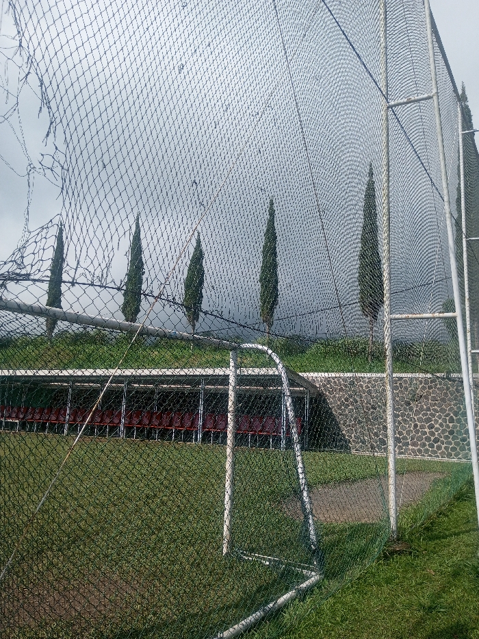 The scene depicts an outdoor facility in Unknown, Vietnam, viewed through a large, dark-colored protective netting exhibiting multiple tears and frayed sections. In the immediate foreground, the netting is supported by white metal poles, and a white, bent tubular metal frame is observed on the green grass. Beyond the netting, a grassy area leads to a section of uncovered red spectator seating beneath a white-framed roof structure. To the right of the seating, a sloped retaining wall constructed from stacked stones is visible, alongside a narrow, unpaved dirt path. Five slender, conical evergreen trees are aligned on an elevated grassy terrain in the background, set against an overcast, light grey sky. Distant, indistinct landforms are faintly discernible on the horizon. No individuals or specific actions are visible within the frame.