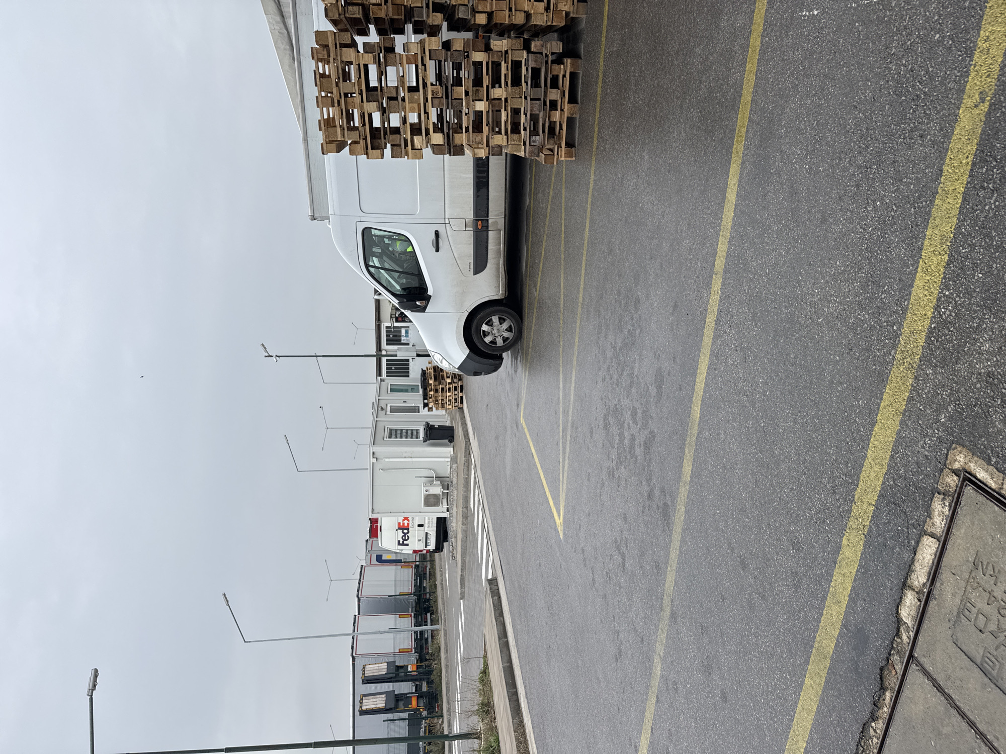 parking area in what appears to be an industrial or commercial zone. A white van is parked in a marked space with yellow lines. Stacks of wooden pallets are alongside the van. In the background, there are several trucks and what appear to be portable office trailers, one of which has a FedEx logo. The sky is overcast. The image was taken in Sofia, Bulgaria, judging by the license plate on a nearby FedEx vehicle. The ground is wet, and the overall atmosphere suggests a working environment.