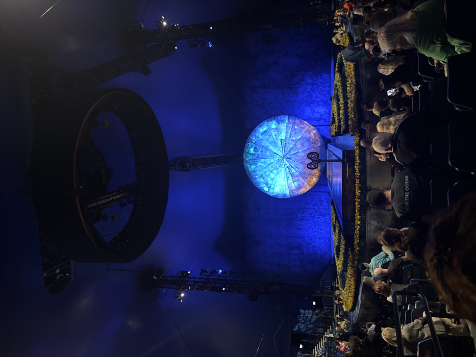 The image depicts an indoor performance venue, likely a large tent or arena, located in Hallandale Beach, United States of America. The scene is dominated by a dimly lit, dark blue environment, with a stage set bathed in vibrant blue and orange light at the far end. In the center of the stage is a large, segmented circular object, illuminated from within, displaying a gradient of bright blue on the upper left transitioning to orange on the lower right. This object resembles a stylized sun or an ancient mechanical device. Directly in front of this circular object stands a prominent, large, black, stylized winding key. A raised, dark rectangular platform extends from the base of the key towards the audience. Surrounding the central stage area and the platform are tiered rows of yellow, flower-like decorations or flora. The backdrop behind the main circular object is a textured wall, lit with a deep blue hue. Overhead, a large, dark circular truss structure is suspended from the ceiling, containing lighting fixtures and rigging. Additional vertical truss towers with spotlights are positioned on either side of the stage. The ceiling itself is a dark blue fabric. In the foreground and extending towards the left side of the frame, numerous individuals are seated in dark-colored chairs, arranged in rows. They are observed from behind, generally facing towards the stage, passively observing the performance area. Visible details include a person in the mid-ground wearing a dark shirt with "FOR THE OCEAN" printed on the back. No specific interactions or actions beyond observation are discernible among the audience members.