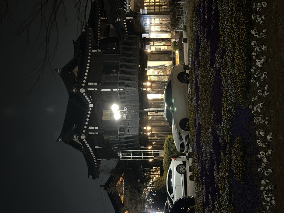 The image displays a nighttime scene in Gyeongju-si, South Korea. The central focus is a two-story traditional Korean-style building, or Hanok, constructed from dark wood with white decorative trim along its eaves and second-story balcony railing. It features multiple curved, dark tiled roofs and appears to house commercial establishments on its ground floor, indicated by large glass windows and warm interior lighting. A twin-lamp street light stands directly in front of this building. To the left, another smaller, illuminated Hanok structure is partially visible. Three vehicles are parked in the mid-ground: a white Mercedes-Benz CLS coupe, a white sedan partially obscured behind it, and a dark-colored vehicle on the far left. No individuals are present or engaged in any actions. The foreground consists of a manicured flowerbed containing distinct rows of purple, yellow, and white small flowering plants, consistent with pansies. The sky is dark and featureless.