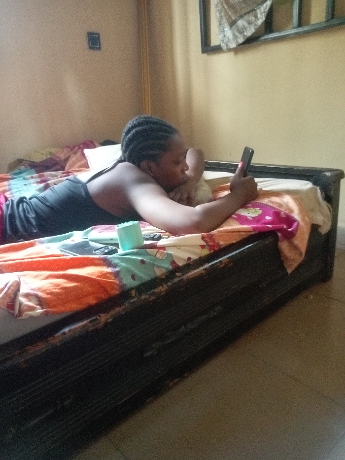 A female individual with braided hair and dark skin lies prone on a bed in an indoor setting in Igbenu, Nigeria