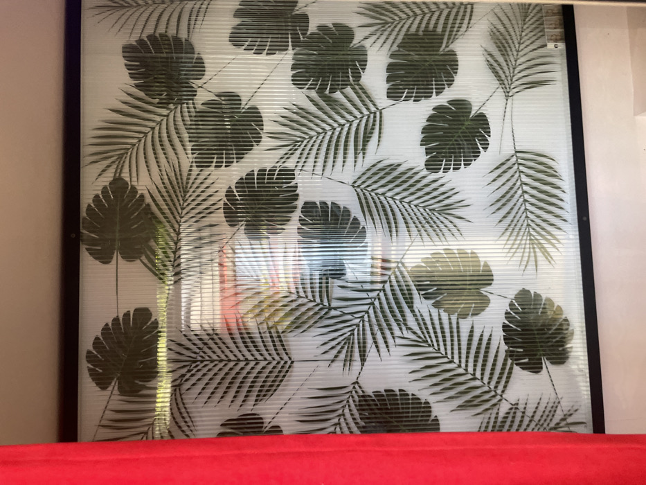 The scene displays a vertically oriented, translucent panel with a fluted texture, adorned with a repeating pattern of dark green tropical leaf silhouettes, specifically palm fronds and Monstera leaves