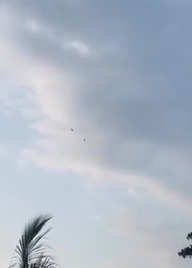 view of the sky with several birds flying. The sky is light blue with some white clouds. The camera is pointed upwards, and the tops of trees are visible at the bottom of the frame, with a palm tree prominently featured on the left side. The birds are dark and appear to be soaring.