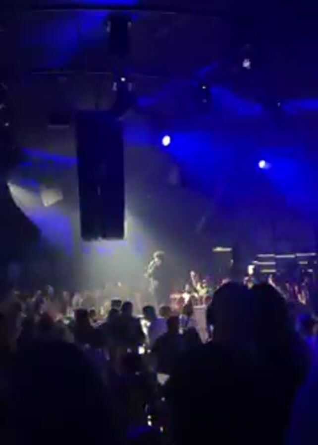 singer performing on stage in a crowded nightclub. The singer is wearing a dark jacket and standing in front of a microphone. The crowd is densely packed and enthusiastically moving, presumably dancing. Stage lights in blue and green illuminate the scene, creating a vibrant atmosphere. There are also large speakers visible on the side of the stage.
