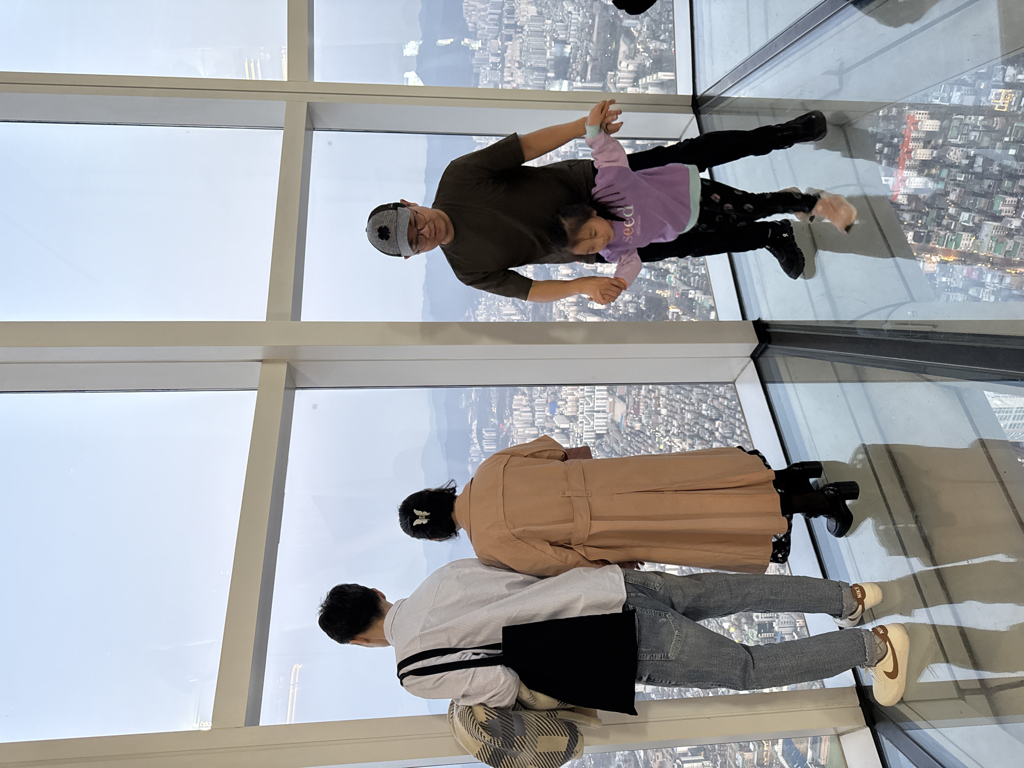 Four individuals are observed within a modern, high-rise indoor observation deck, specifically identified as the Seoul Sky at Lotte World Tower in Seoul, South Korea. The setting features expansive floor-to-ceiling windows and a transparent glass floor section providing a direct view of the urban landscape below. On the left, an adult male stands with his back to the camera, wearing a white and light blue striped long-sleeve shirt, blue jeans, and light-colored Nike sneakers. He carries a black tote bag over his left shoulder and a beige and grey checkered blanket or scarf draped over his left arm. Adjacent to him, an adult female also faces away from the camera, wearing a light brown trench coat, black tights, and black high-heeled loafers. Her dark hair is adorned with a white butterfly clip. Both individuals are looking out the large windows at the panoramic city view. To the right, an adult male faces the camera, wearing a dark olive green t-shirt, dark trousers, black sneakers, and a grey baseball cap with a four-leaf clover emblem. He holds the outstretched hands of a young female child who stands in front of him. The child wears a light purple long-sleeve top with "seed" printed on it, dark patterned leggings, and light brown soft-soled shoes. Her arms are extended horizontally as if balancing or playing. The floor beneath the adult male on the right and the child is transparent glass, clearly reflecting the numerous buildings of the city directly below them. Beyond the windows, a dense cityscape extends to the horizon, where hazy mountains are visible under an overcast sky.