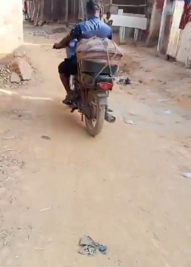 A man on a motorcycle rides away from the camera on a dirt road. The road has patches of grass and some trash scattered around. The motorcycle has a large woven basket strapped to the back. The man is wearing a blue shirt, black shorts, and a baseball cap. Two people are visible in the background, one running and the other standing. The buildings on either side of the road appear to be simple structures, with corrugated metal roofs. Some clothes are hanging outside one of the buildings. The lighting is bright and the video appears to be taken during the day.