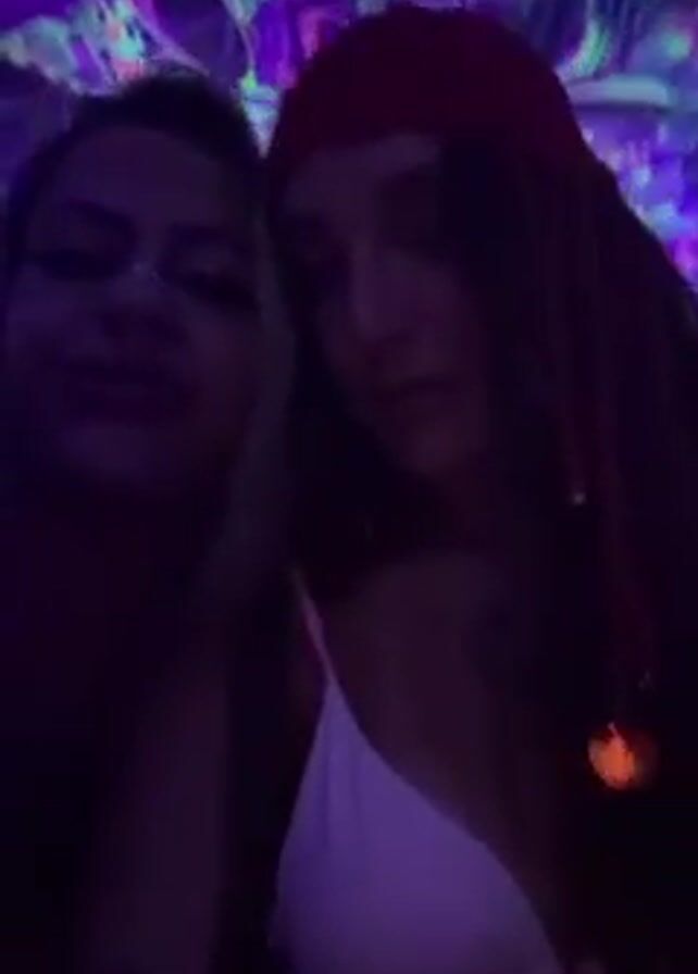 Two women smile into the camera in a dimly lit indoor space. The woman on the right is wearing a red bandana and a white bikini top. The other woman has glasses and is smiling. A colorful psychedelic design can be seen on the ceiling behind them. The women seem happy. Loud music plays in the background.