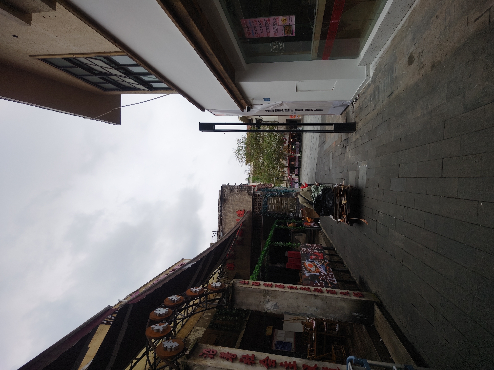 street in the Chongqing High-tech Zone, China, between buildings. The street is paved with dark grey bricks. A cart loaded with items is visible in the distance. Buildings flank both sides of the street, with Chinese characters displayed on the buildings, along with commercial signs and restaurant posters. The sky is overcast. A modern street lamp stands in the middle of the street.