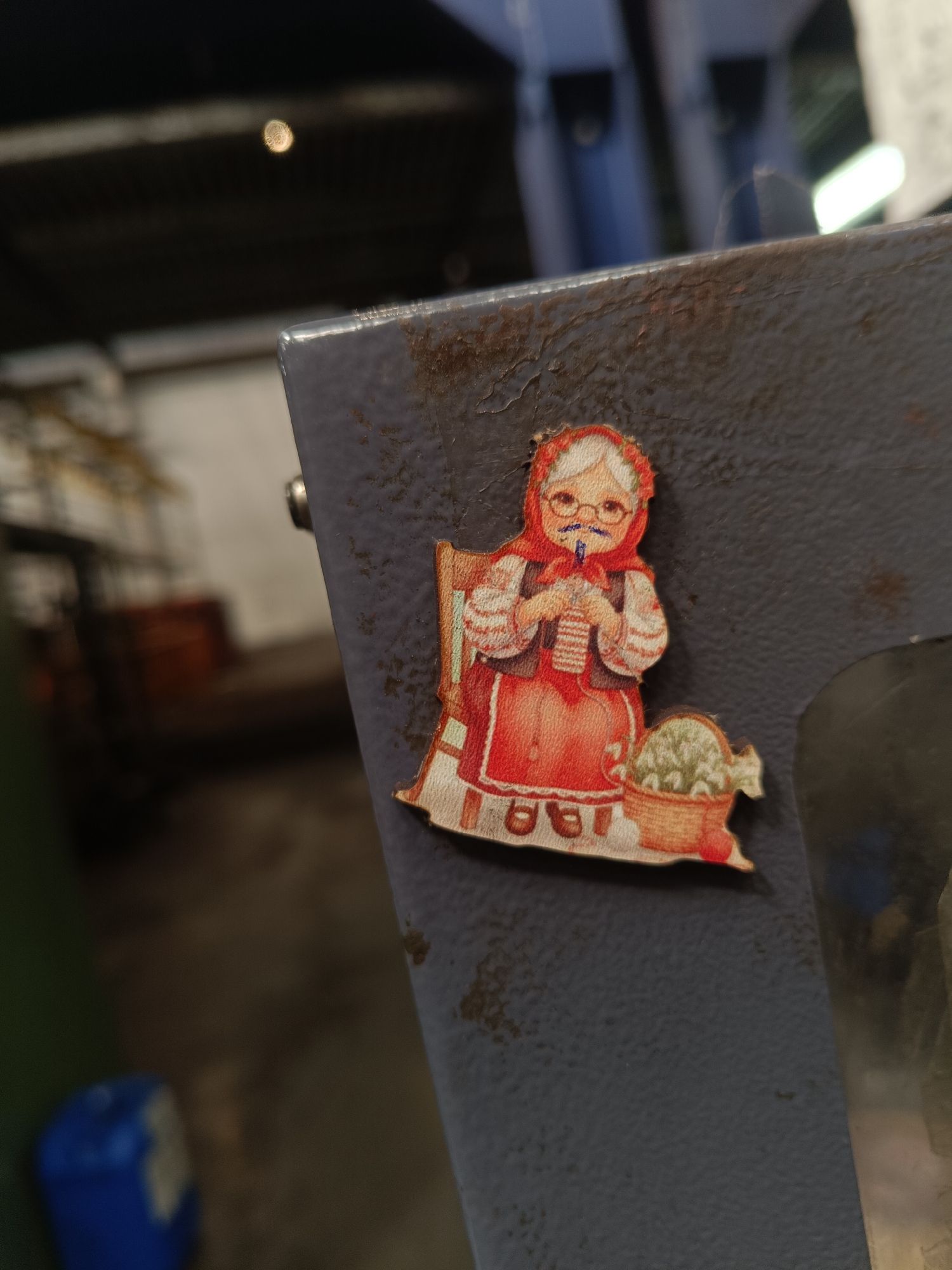 A cut-out refrigerator magnet depicting an elderly woman is affixed to a dark grey, rusted, and worn metallic surface, likely part of industrial equipment, in an unidentified indoor location within Shumen, Bulgaria