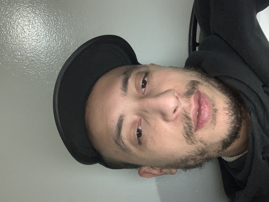 A person wearing a black cap and a dark hoodie is facing the camera. The individual has medium-brown eyes, a beard, and light-brown skin. The background is a plain, light-gray wall. The photo appears to be taken indoors. The person's gaze is directed towards the camera, with a slight tilt of the head. Their facial expression is neutral.