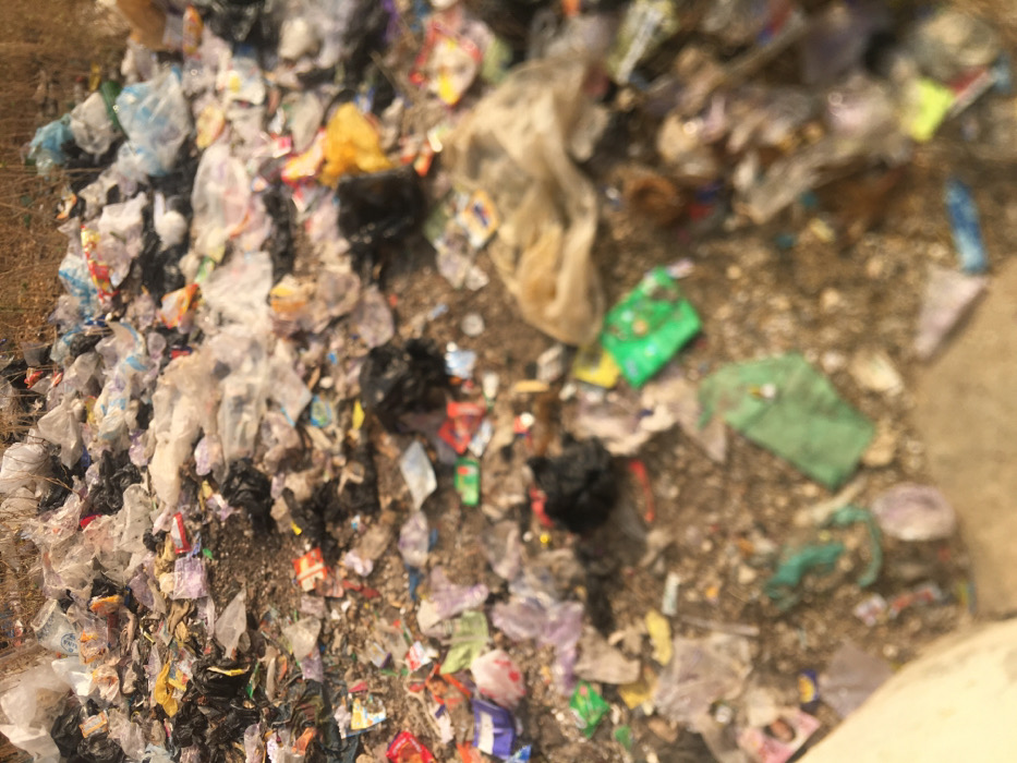 The image depicts an extensive accumulation of discarded materials covering a substantial ground area in Katcha, Nigeria. The scene is dominated by a dense spread of diverse plastic bags, prominent colors include white, black, and transparent, along with various multi-colored plastic wrappers and packaging. The items are scattered across an irregular, unpaved surface composed of dirt and small stones, indicating an informal waste disposal site. Faint traces of dry vegetation are visible in the background. No individuals or discernible actions are depicted. The overall impression is one of widespread refuse and environmental degradation.