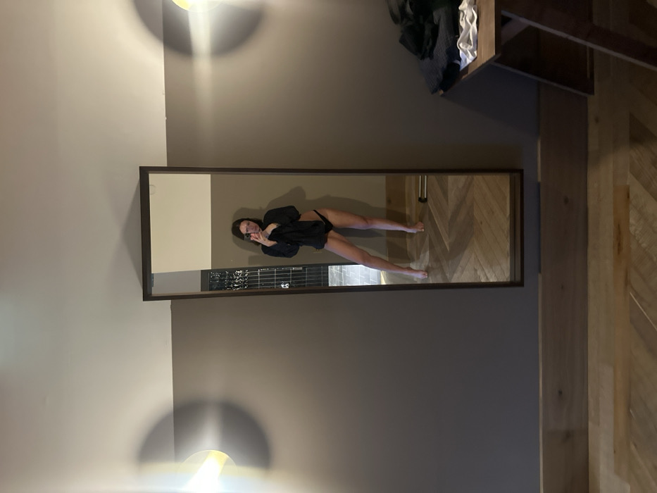 The image displays an interior room in Manchester, United Kingdom. A specific address or identifiable landmark within Manchester is not discernible from the visual content. **Scene Description:** A full-length, dark-framed mirror is positioned centrally against a wall. The wall features a two-tone paint scheme: an upper section of off-white or light beige and a lower section of taupe-grey. Two identical circular wall sconces, emitting warm yellow light, are mounted on the wall, one on each side of the mirror, casting distinct shadows. The floor is covered in light-colored wooden planks arranged in a herringbone pattern, with a matching wooden baseboard along the wall. **Person and Actions:** Reflected in the mirror is a female individual, appearing to take a selfie using a smartphone held in both hands. She is dressed in an open, dark, long-sleeved shirt and dark bikini bottoms or underwear. She stands barefoot, with her left leg extended and her right leg slightly bent at the knee. **Objects and Environment:** In the background of the reflection, behind the individual, a dark, vertical, textured element resembling a metal grate or railing is visible. A silver-colored metallic pole or stand lies horizontally on the floor near the individual's right foot within the reflection. To the right of the mirror, a small wooden table with an 'X'-shaped base holds a pile of folded dark clothing and some white fabric. The room presents a modern, minimalist aesthetic.