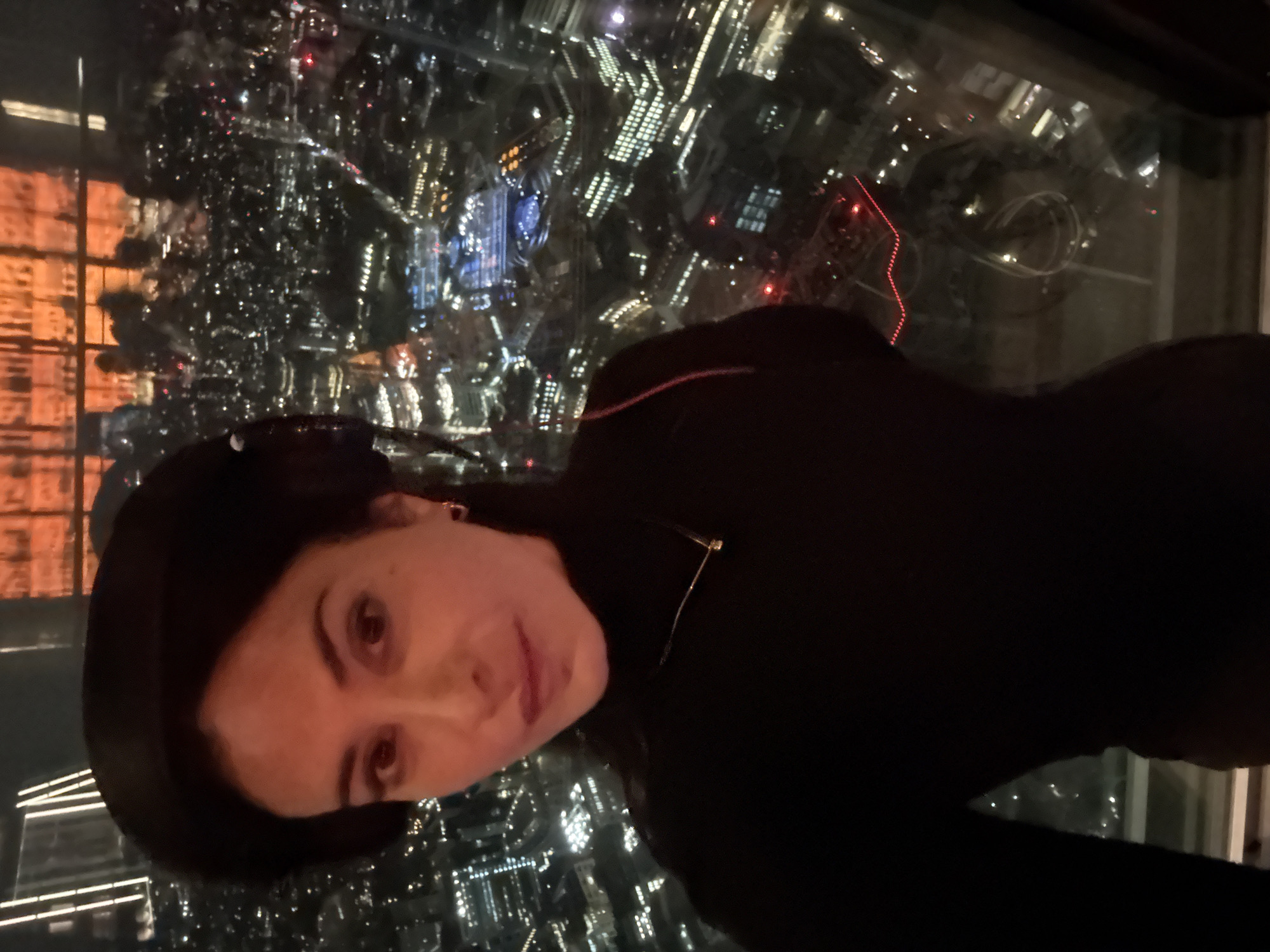 A woman in a black dress and hat poses in front of a window overlooking London at night