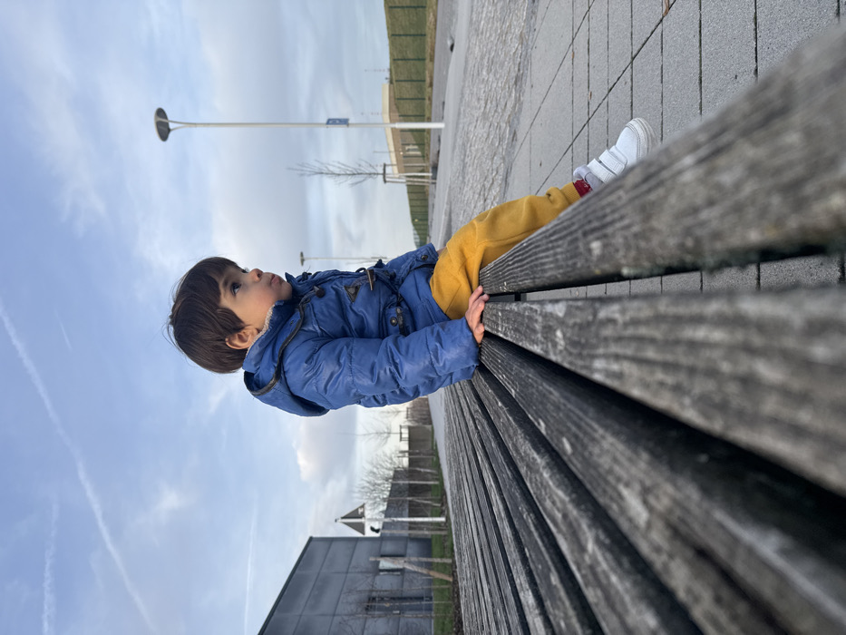 - "A child wearing a blue jacket and yellow pants reclines on a wooden bench outdoors" by FM-H0rwJ2, licensed under CC BY 4.0