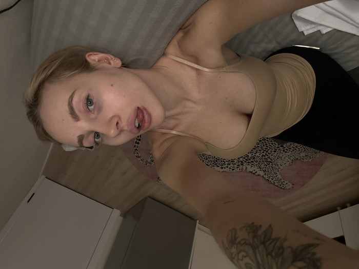 A blonde woman with blue eyes gazes at the camera while reclining. She wears a beige tank top and black leggings. A leopard-print item rests under her chest. The woman has multiple piercings in her ear. Her left arm, featuring a dark tattoo, extends into the foreground. Background elements include a gray sofa, a pink and leopard-print rug, white cabinets, and a glimpse of a white cloth. The photo seems to be taken indoors.