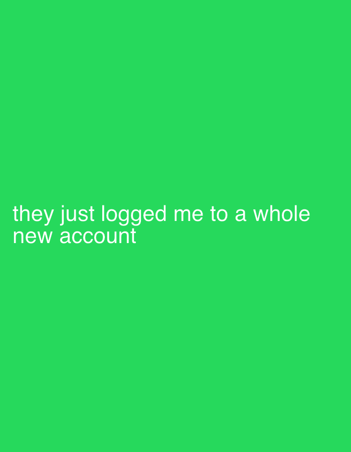 A solid green background displays the text "they just logged me to a whole new account" in white