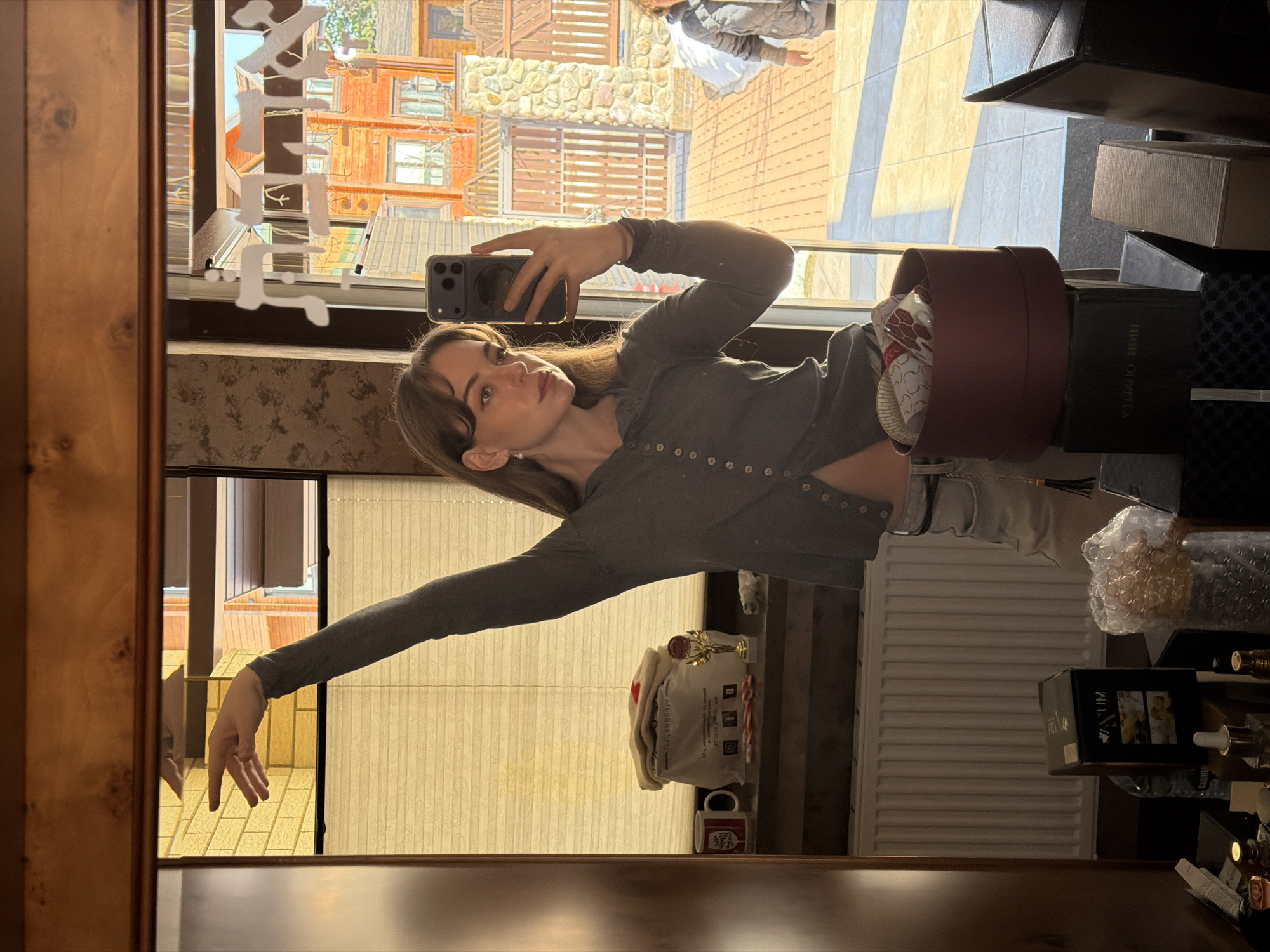 A woman is taking a mirror selfie indoors. Outside the window, there are buildings, a street, and possibly people, characteristic of an urban setting, potentially Mishutkino, Russia. The immediate surroundings consist of interior items such as boxes, a radiator, and personal items. The woman is holding a phone, presumably to capture the reflection.