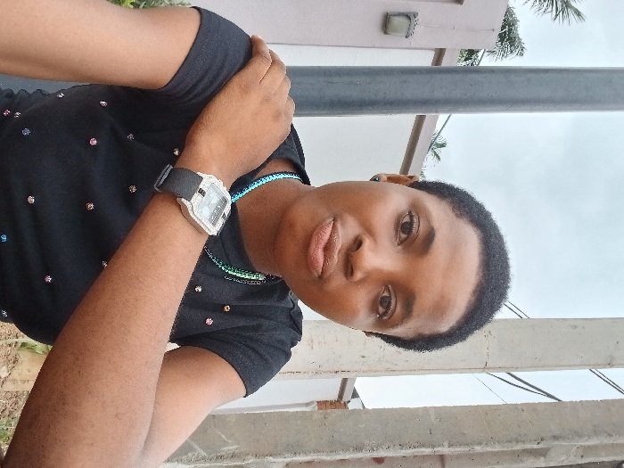 An outdoor portrait captures a young adult female with short, dark hair and dark skin, looking directly at the camera. She wears a black short-sleeved top adorned with small, colorful studs and a multi-colored beaded necklace. On her left wrist is a large, square, silver-toned wristwatch with a black strap. Her right hand is positioned on her left shoulder. The background on the left shows a segment of a light-colored building wall with a square outdoor light fixture, next to a dark grey pole. To the right, several light-colored concrete utility poles are visible. Green foliage, including palm fronds, is present in the upper left and lower right, suggesting an outdoor, possibly residential or semi-urban, environment in Ikeja, Nigeria. The sky is overcast.