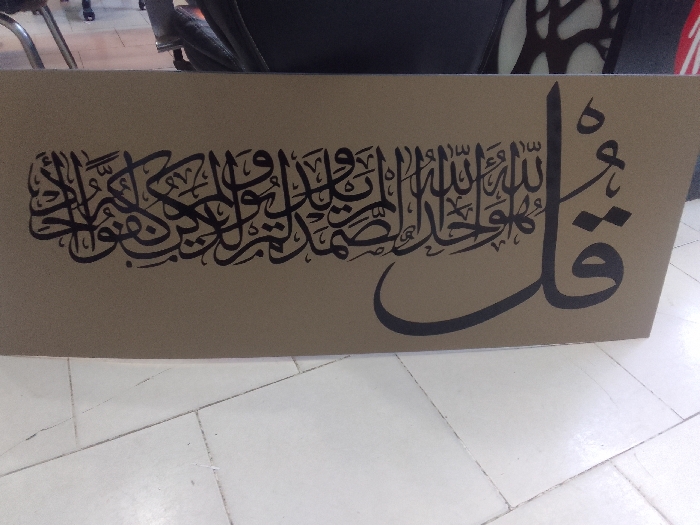 A rectangular board, light brown or tan in color, displays black Arabic calligraphy in a horizontal arrangement