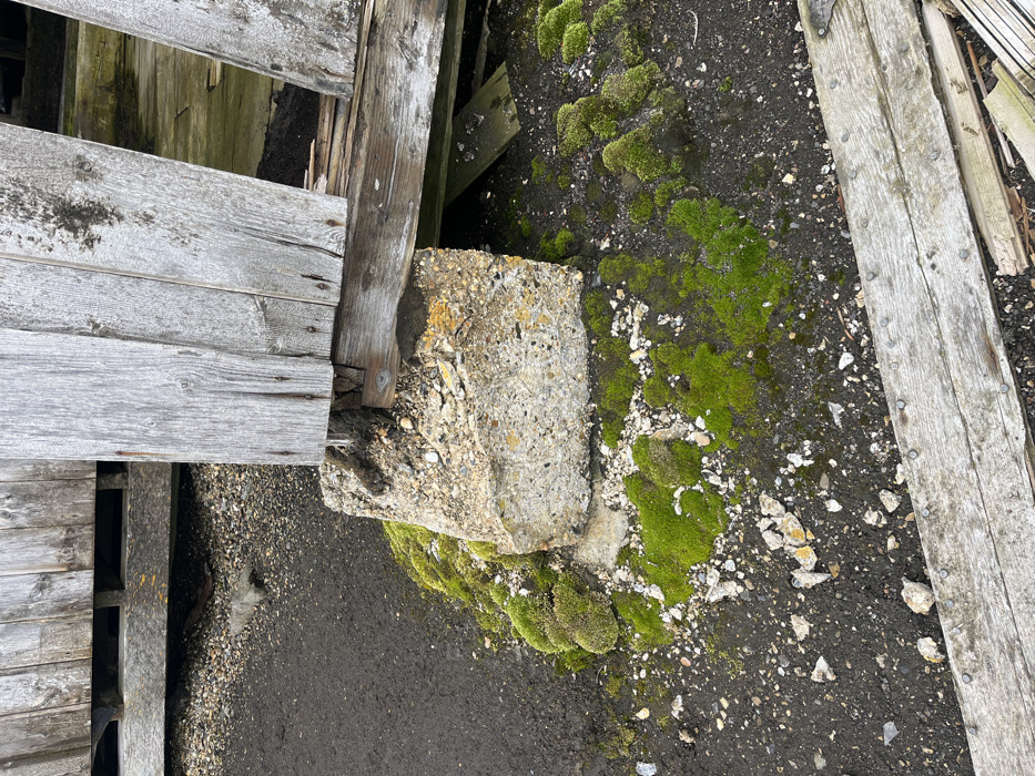 - "A close-up depicts weathered wooden structures intersecting at an angle, resting upon a concrete block partially covered in moss" by FM-SiGDg2, licensed under CC BY 4.0