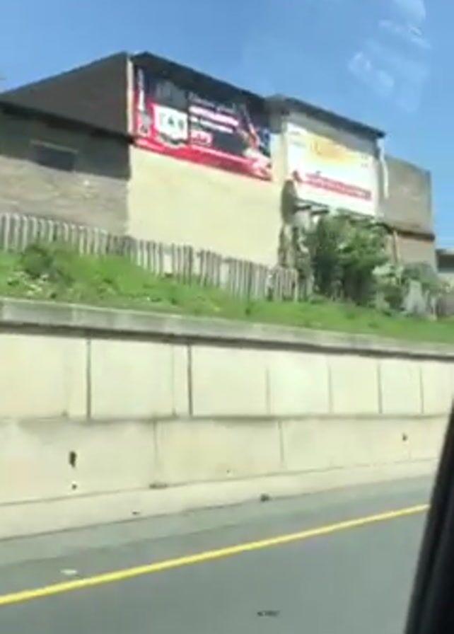 The video, shot from within a moving vehicle, shows a concrete wall running alongside a highway