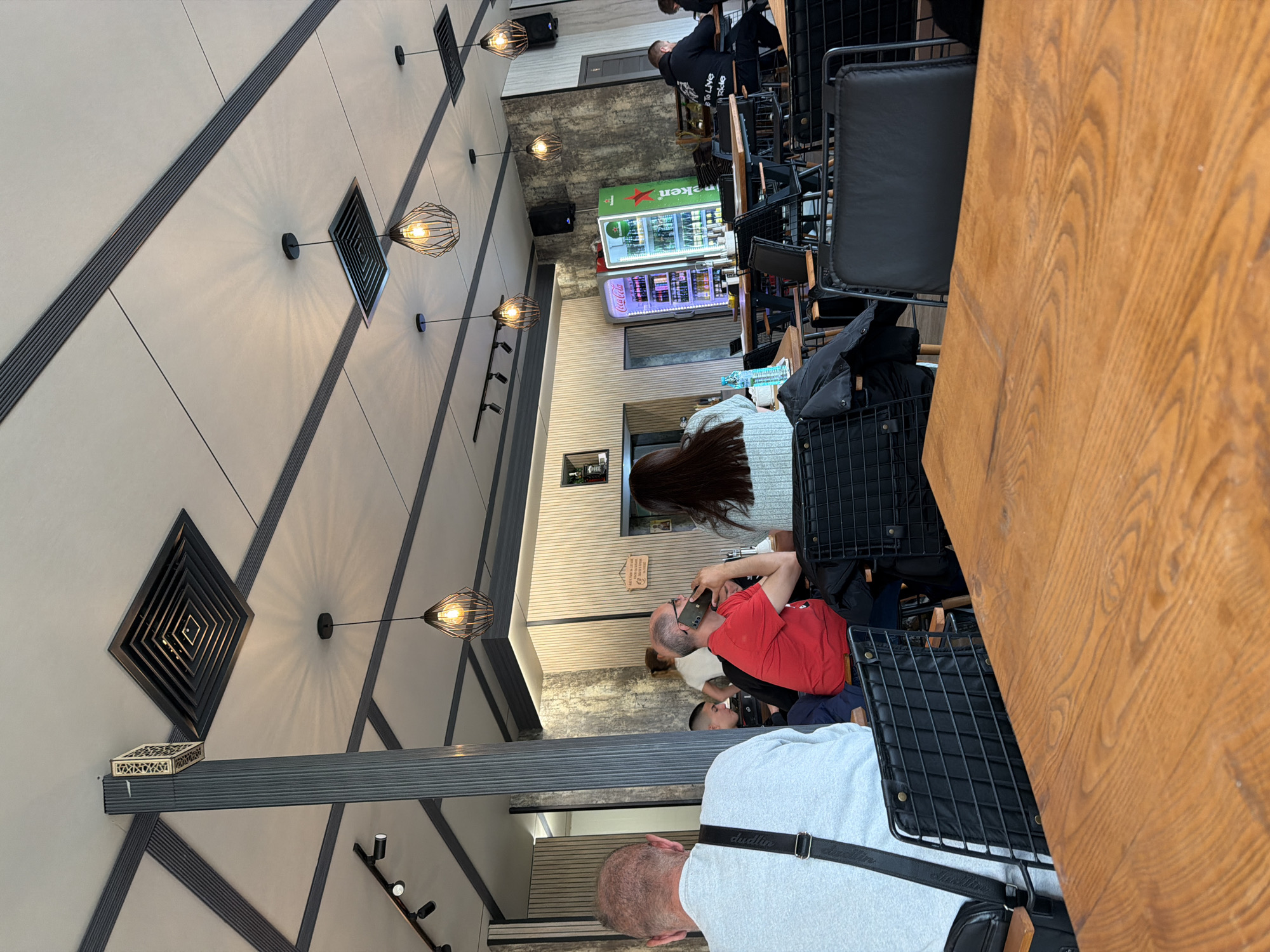 The photograph depicts an indoor scene in what appears to be a café or restaurant. There are several individuals present, some seated at tables. One man is wearing a red shirt and talking on a cell phone. Another man is wearing a light gray shirt. A woman with long hair is also present. There are wooden tables and black wire chairs, along with overhead lighting fixtures. In the background, there are refrigerators displaying beverages. The geometric pattern of the ceiling is visible and consistent with modern architectural design. It is plausible that this image was taken in or around Rudartsi, Bulgaria, given the context of the prompt.