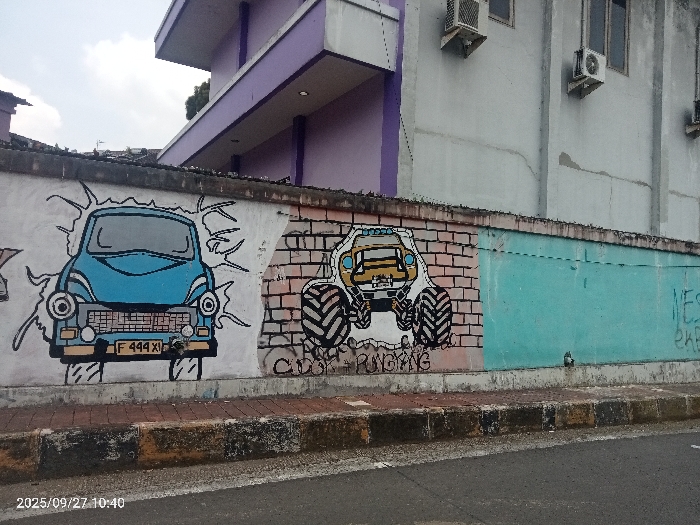 The image depicts an exterior scene in Ntunene ward, Kenya, featuring a street-level view of a long concrete wall adorned with murals, a sidewalk, and a road. In the background, a multi-story building is partially visible. The wall, approximately 1.5 meters high, runs horizontally across the midground. Its left section is painted white and features a cartoon-style mural of a light blue vintage car, depicted from the front, with a license plate reading "F 444 XI". To its right, the wall transitions to a faux brick pattern, then to a light turquoise color. On the brick section, a yellow and black monster truck mural, also facing forward, is present; text partially legible as "PUNYYNG" appears beneath it. The turquoise section on the far right has faded green or black graffiti text. A narrow sidewalk, paved with reddish-brown bricks, lies directly in front of the wall. A curb, painted with faded black and yellow stripes, separates the sidewalk from a dark asphalt road in the foreground. Behind the wall, a building of at least two stories is visible. The left side of the building features a purple facade with darker structural beams. The right side is light gray, showing cracks and wear, and has three external air conditioning units mounted beneath rectangular windows. No individuals, animals, or discernible actions are present in the frame. The sky is overcast. A digital timestamp "2025/09/27 10:40" is present in the lower-left corner.