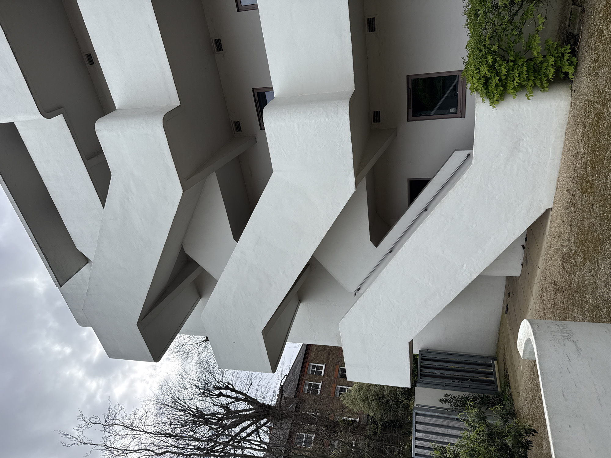 The image captures the architectural detail of the Balfron Tower, a Grade II listed residential building in Poplar, London, United Kingdom. The structure is notable for its Brutalist design, with protruding cantilevered sections coated in white. Small, dark windows are visible within these sections. A sky overcast with gray clouds is overhead. A skeletal tree stands in the foreground, its bare branches reaching towards the structure. Beyond the Balfron Tower, another building, constructed of brown brick with white-framed windows, peeks from behind the leaves of a tree. At the base of the tower, a patch of greenery is present. A dark metal fence is positioned near the greenery. A rounded concrete structure stands on a paved surface.