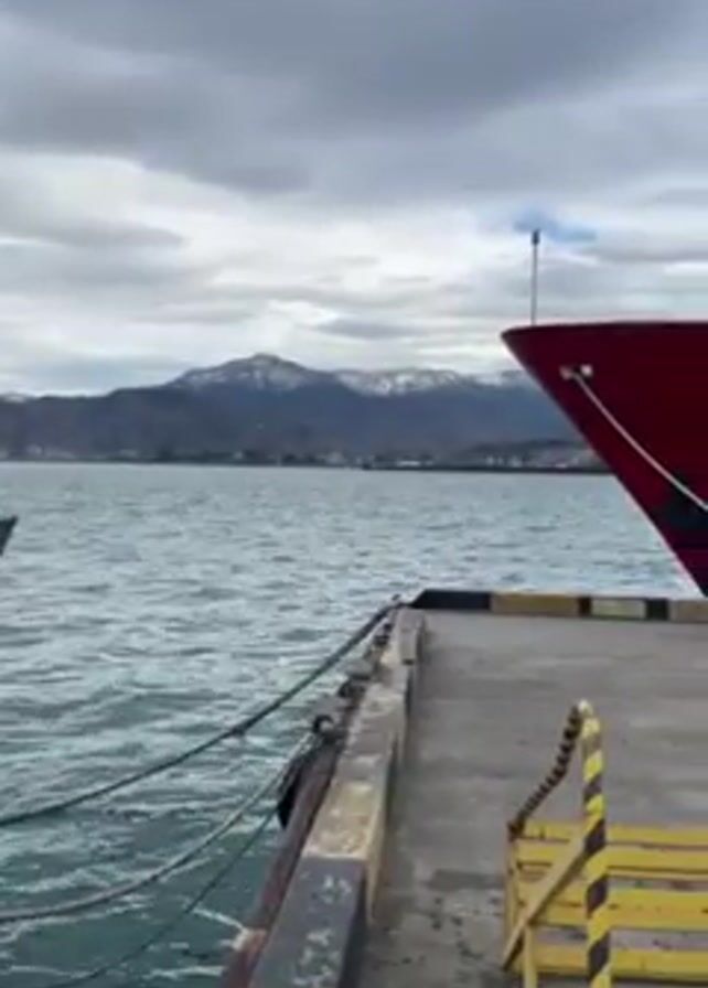 bright red boat docked at a pier. The name "CAPT. TENIZ GADILIA" is painted on the front of the boat. A yellow and black metal structure, likely steps, sits on the pier in front of the boat. The pier is made of concrete and has metal chains and fixtures along the edge. A body of water stretches out from the pier, and in the distance, there are mountains with snow on their peaks under a cloudy sky. A woman in a pink coat walks along the boat.