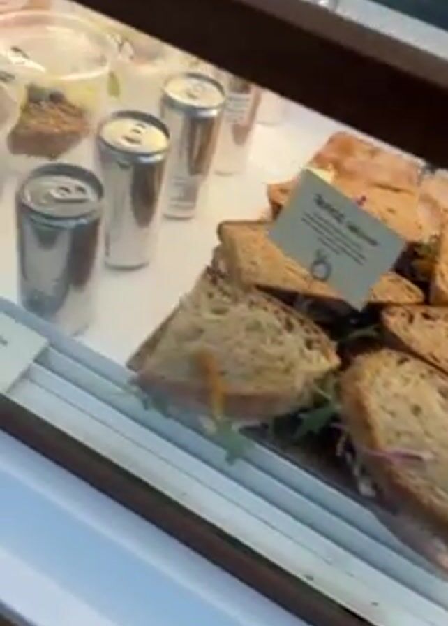 interior of a cafe display case. The top shelf displays sandwiches on wooden boards, with small signs identifying the contents. Below, there are individual plastic cups containing fruit and granola. There are also cans of cold brew coffee. The bottom shelf showcases various cakes and pastries, including layered chocolate cake, several muffins or small cakes with toppings, brownies, and a tart or pie. The shelves are well-lit and clean. The overall setting is a bright and inviting cafe environment. The camera moves slowly, providing a view of the various food items available.