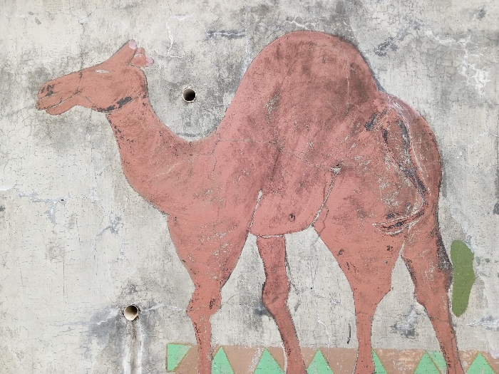 - "An outdoor mural on a weathered concrete wall in the city of Voa Yeav, Cambodia, depicts a large, reddish-brown dromedary camel in profile, facing left" by FM-mvqYv1, licensed under CC BY 4.0