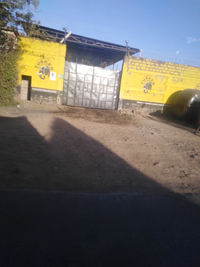 A weathered yellow building with a large metal gate, possibly a factory or warehouse. The "Tusker" logo, featuring an elephant, is prominently displayed on both sides of the gate. A small doorway is visible on the left side of the building. The ground in front of the building appears unpaved. The sky is clear and blue.