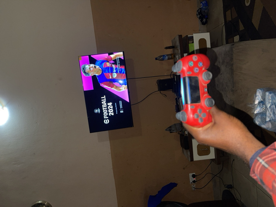 The image depicts an indoor setting in Unguwar Gabas, Nigeria, focused on entertainment. A dark-skinned right hand, partially obscured by a red and white plaid shirt sleeve, holds a red PlayStation DualShock 4 controller, which exhibits a blue light from its light bar. In the mid-ground, a black flat-screen television is mounted on a two-toned wall, displaying the title screen for "eFootball 2024," featuring a male football player in a blue and red striped FC Barcelona jersey with a Spotify logo. The text "Press Any Button" is visible below the game title. Below the television, a wooden console table holds a black electronic device (likely a gaming console), a plastic water bottle, a small black object, and a clothing iron. Power cords are visible connected to wall outlets. The room has a two-tone wall, with a lighter upper section and a darker brown lower section. A bare light bulb illuminates the ceiling, and a portion of a ceiling fan is visible on the far left. The floor is tiled, and a dark-colored sofa is partially visible in the lower mid-ground. A crumpled blue plastic item is on the floor in the lower right.
