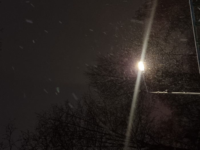 Nighttime scene with snow falling. A street lamp casts a bright light amidst bare tree branches. The dark sky contrasts sharply with the illuminated area around the lamp. Snowflakes are visible throughout the frame, creating a sense of winter ambiance. The composition is simple and focuses on the contrast between light and darkness in a snowy night.