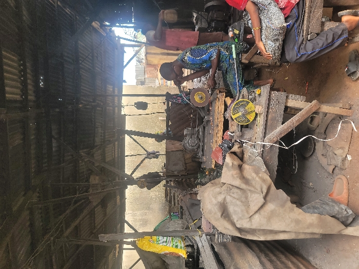 interior of a workshop in Oko Erin, Nigeria. The workshop is located at coordinates 8.48 latitude and 4.504 longitude. The workshop appears to be a metalworking shop. There are two men working in the workshop, one man is sitting at a workbench, using a grinder to sharpen a metal object. The other man is sitting on a stool, watching the work. There is a lot of metal debris and tools scattered around the workshop. The workshop is partially covered by a corrugated metal roof. The environment is dusty and cluttered. The men are wearing simple clothing. The scene suggests that this is a typical day in a small Nigerian workshop.