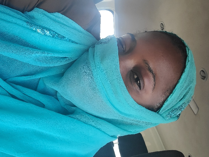 The image depicts an individual with dark skin, partially obscured, positioned within the interior of a vehicle. The person wears a light turquoise head covering that functions as both a headscarf and a face veil, exposing only the eyes and eyebrows. The visible fabric features scattered sequins, particularly on the upper part covering the head and a vertical strip on the left side of the subject's chest. An underlying brown garment is visible on the left shoulder. The individual's dark eyes look directly at the viewer; the right eye appears slightly closed or winking, while the left eye is fully open. The background reveals beige vehicle ceiling panels with two oval overhead lights. A dark headrest or seat back is visible on the right, and part of a brown seat on the left. The scene does not provide any specific external or internal landmarks to confirm the location as the city of Idon, Nigeria; it is an interior vehicle shot.